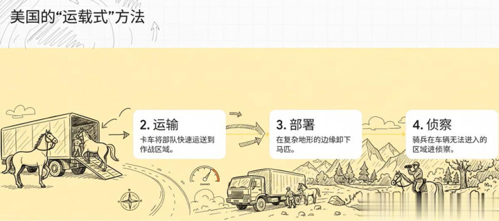 好意思国东说念主的想路更专诚义,搞了个混搭风。他们专门规划了一种卡车,把马队和马沿途装上去,用卡车的速率把队列快速运到前线隔邻。到了汽车开不进去的复杂地形,再把马卸下来,让马队骑着马进去考查。说白了,等于想用卡车的速率,加上马的全地形能力,搞个强强蚁集。