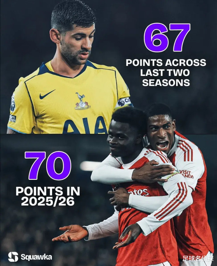 Squawka统计,驯服埃弗顿之后,阿森纳本赛季英超积分达到70分,比热刺最近两个赛季的积分总数还多!