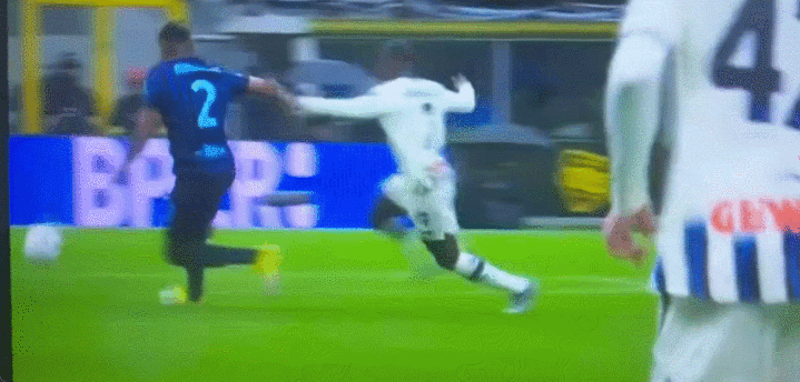 第一个争议判罚,是亚特兰大的进球,苏莱曼纳推倒了邓弗里斯后,取得了射门契机,形成门将动手后补射破门。