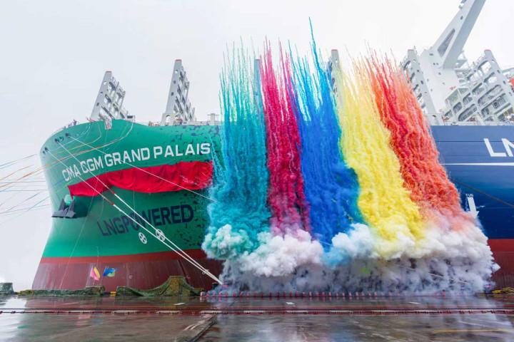 [环球时报-环球网报说念记者郭媛丹]17日,记者从中船集团旗下沪东中华造船(集团)有限公司获悉,由沪东中华配置的民众最大24000TEU级液化自然气(LNG)双燃料能源集装箱船“达飞巴黎大皇宫”号,提前7个半月在上海长兴岛定名请托。