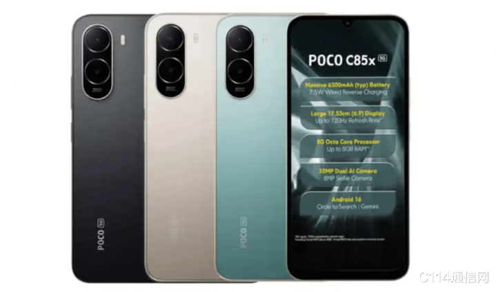 报说念表现,POCO C85x 5G将于3月14日在印度商场厚爱发售,起售价10999卢比(约合119好意思元)。这款机型搭载一块6.9英寸1600x720永别率的表现屏,最高辅助120Hz的刷新率;配备紫光展锐T8300芯片,内置4GB LPDDR4x RAM和64GB/128GB存储空间;辅助插入microSD卡,最高可彭胀至2TB。