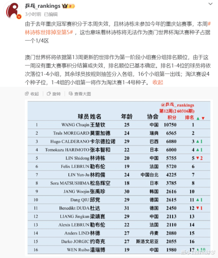 国乒诠释注解组在阐明让林诗栋退出重庆冠军赛时应该就知谈林诗栋的寰球名次会跌至第五,这对澳门寰球杯的种子位有重大的影响。