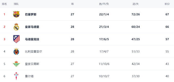 在积分榜上,巴萨也曾高居榜首,战绩是22胜1平4负,拿到67分。皇马赢球之后,总积分达到66分,只是逾期巴萨1分,屈居第2名。不外,皇马比巴萨多踢1场。显著6686体育官方网站,巴萨照旧占据夺冠主动权。马竞赢球之后,总积分达到57分,排行升到第3。而比利亚雷亚尔以55分排行第4。第5的是皇家贝蒂斯,只拿到43分,思要进一步栽培排行基本是弗成能的事情。