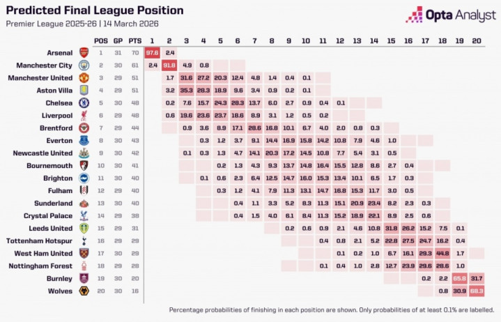 据OPTA专揽超等缱绻机进行的10000次模拟,阿森纳夺得英超冠军的概率为97.6%,曼城夺冠概率为2.4%。至于其他英超18队,夺冠概率均为0%。
