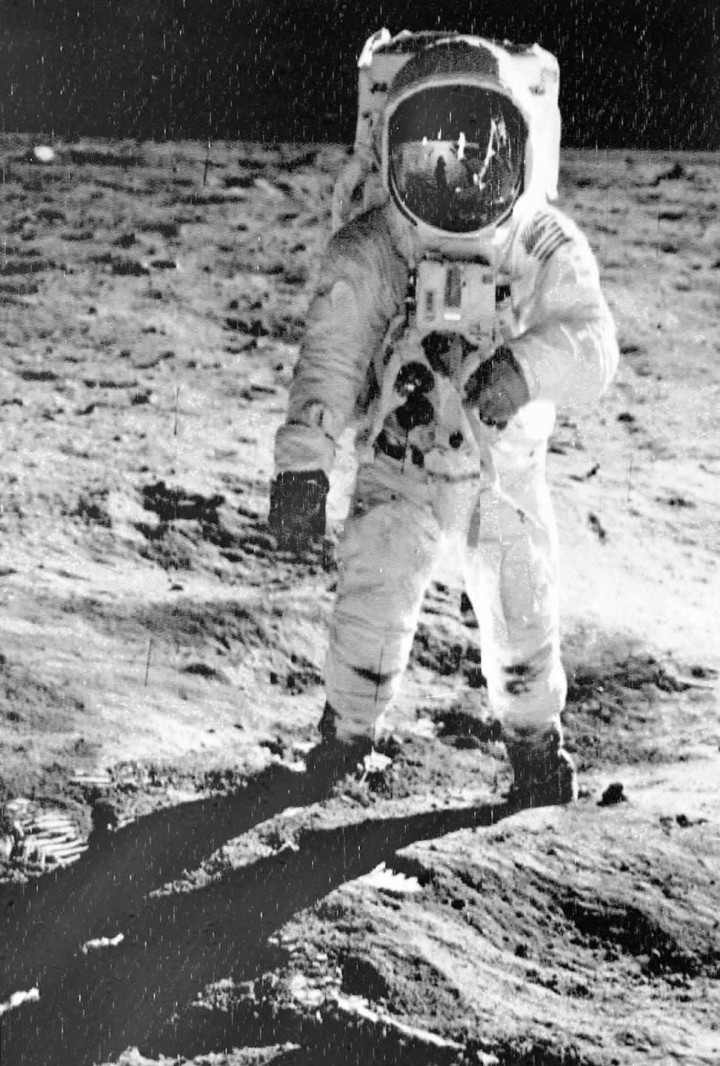 图 | 好意思国宇航员奥尔德林和阿姆斯特朗(头盔中影像)登上月球