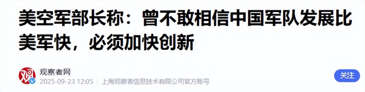 1.《好意思空军部长称:曾不敢深信中国部队发展媲好意思军快,必须加速更动》2025-09-23 12:05 | 来源:不雅察者网