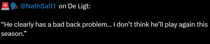 据知情东说念主士裸露,德里赫特本周一直在健身房和康复室进行考研。据称,他的内心备受煎熬,阅历了「地狱般的折磨」。德里赫特好几次王人接近复出了,但老是遭逢远程,伤势一再恶化。