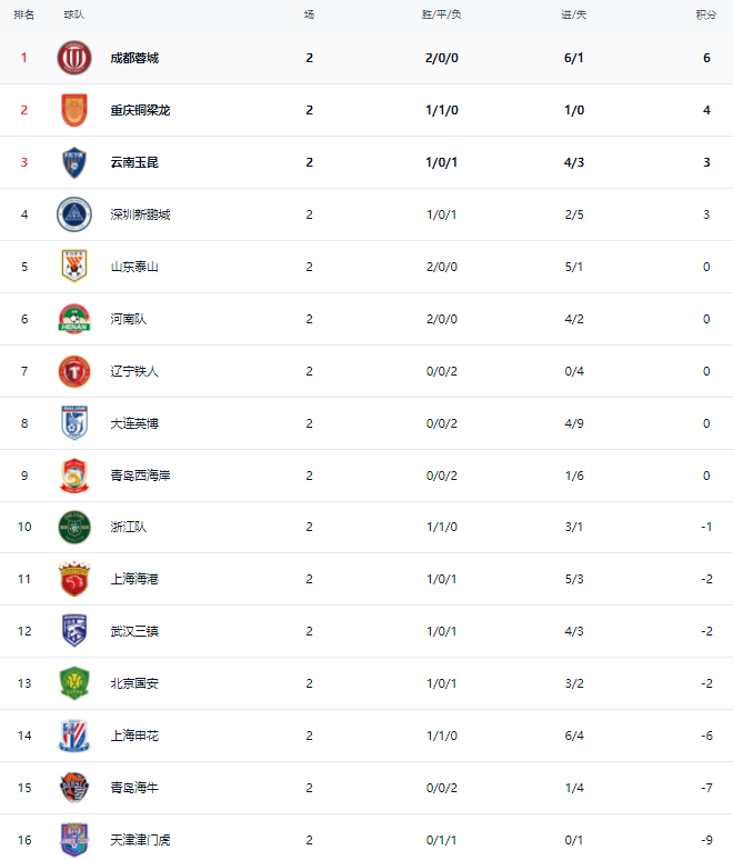 在积分榜上6686体育(6686Sports),成王人蓉城2战全胜,拿到6分,登顶积分榜。重庆铜梁龙拿到4分,排行第2。云南玉昆和深圳新鹏城王人是3分,排行第3和第4名。山东泰山诚然是两连胜,但因为被罚分的问题,导致当今的总积分是0分,排行第5。上海海港赢球之后,总积分是负2分,升到第11名。北京国安1胜1负,亦然负2分,排行第13。上海申花负6分,排行第14。